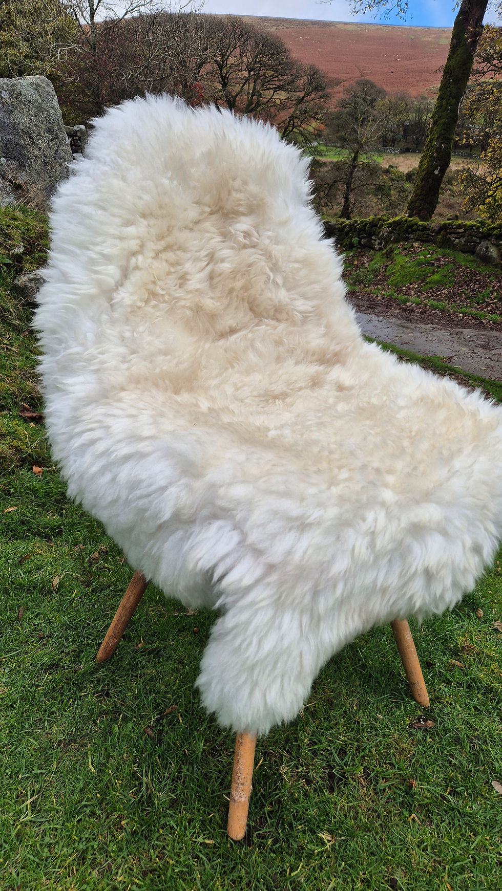 This beautiful fleece is creamy white with a small patch of tan with short (c.5cm) dense soft fibres. Note the camera seems to being fooled by the Autumn sunshine as to the naked eye it's not as brown as it appears in the pictures of itcon the seat - the one of it hanging up is more accurate colour.
